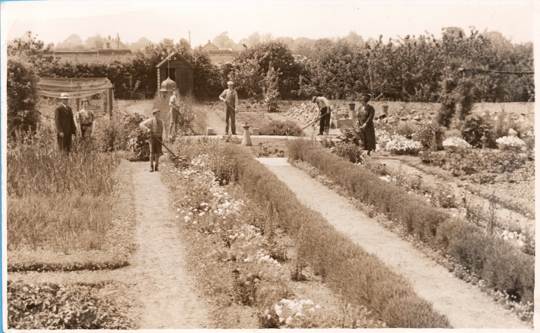 1938 View showing central formal garden with sun dial, rockery and lawn in background. Fruit trees are behind. Courtesy Anne Cooper