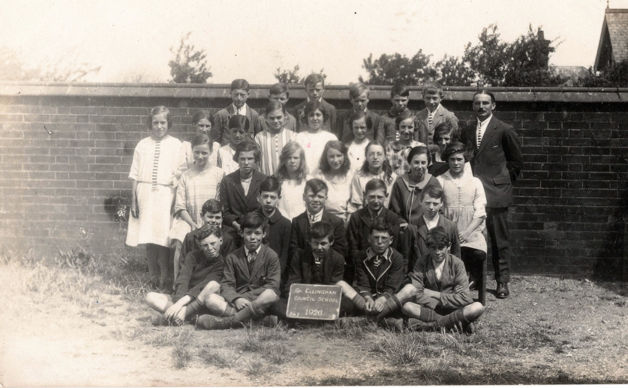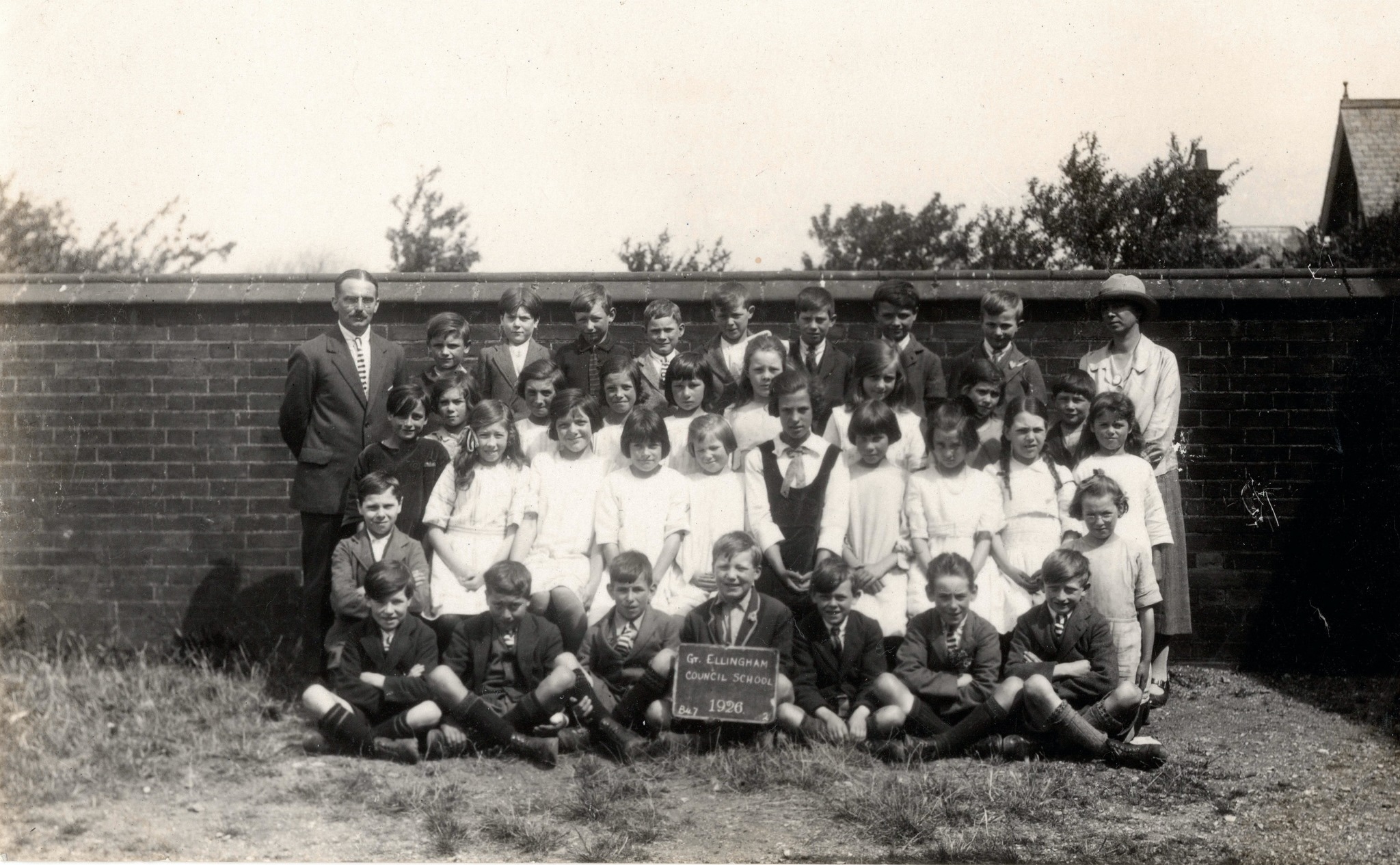 Great Ellingham School. Possibly early 1920s. Mr Field Headmaster. Mrs Overton (nee Ethel Beales) Teacher. Children back row (next to Mr Field) Lily Key, unknown, unknown, Nelly Morter, possibly Josie Sadd, Claud Lebbell. Middle row (next to Mr Field) unknown, unknown, possible Molly Giles, possibly Ray Neave, possibly Myrtle Beales, Herbert Saunders, Lily Hammond. Front row (next to Mr Field) Falcon Lee Billum, George Leverett, Lenny Bowen, Clementine Dorothy Wilkins Skipper, ? Harper, unknown, Olive Saunders. Names as remembered by Herbert Skipper. Photograph Sarah Brand