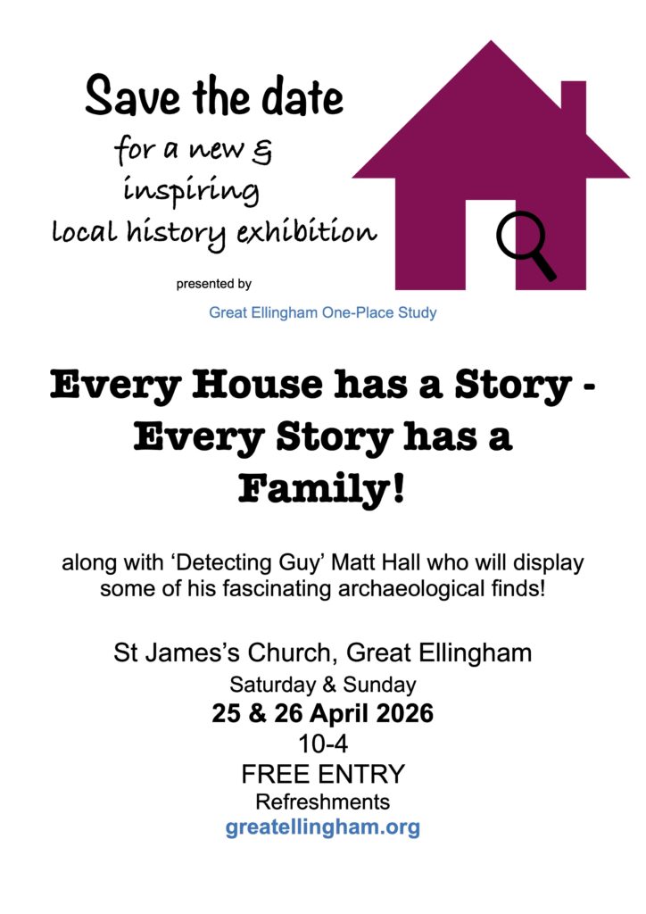 I’m delighted to confirm that another local history exhibition is being planned. “Every House has a Story – Every Story has a Family‘ will be held at St James’s Church, Great Ellingham on 25th & 26th April 2026. With a focus on house and family histories, the new displays are well underway.