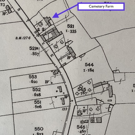 Home Farm was once known as Cemetery Farm. The name probably arose as the farm is adjacent to the track once used by members of the Baptist Church to egress from the Baptist’s Burying Ground. The name ‘Cemetery Farm’ is certainly in use by the turn of the 20th century.